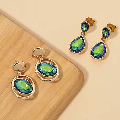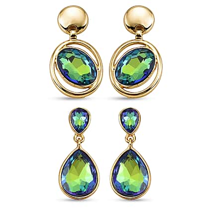 Set of 2 - Green Magic Color Crystal Dangling Earring with Push Back in Yellow Gold Tone