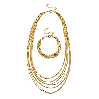 Displaying a rich, layered shine with warm tones, this jewellery set brings depth and standout detail to your styling. The necklace and bracelet are crafted with multiple twisted strands that sit smoothly and reflect light beautifully, creating a soft yet noticeable glow. The full yellow gold tone enhances the overall look, giving it a bold, coordinated finish that feels both eye-catching and easy to wear. The necklace drapes neatly across the neckline, adding dimension without feeling heavy, while the matching bracelet completes the look with the same woven-style texture. Adjustable extension chains on both pieces allow you to customise the fit for comfort and versatility. Add this set to your collection and bring layered shine and strong detail to your everyday look.