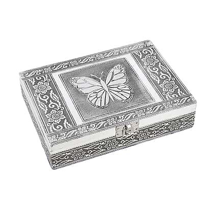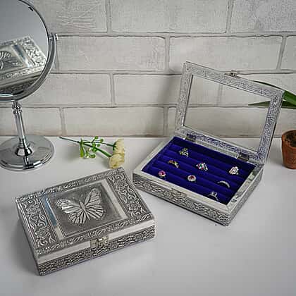set of 2 handcrafted black faux velvety mini aluminum Butterfly engraved Storage boxes with transparent and lion lids