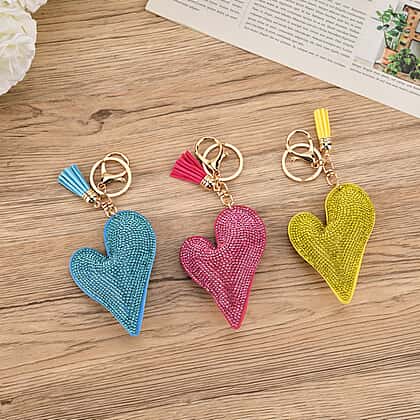 Set of 3 Rhinestone Heart Keychains - Pink, Yellow & Light Blue