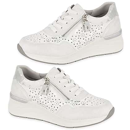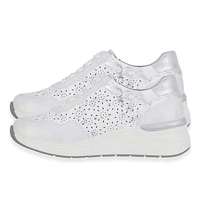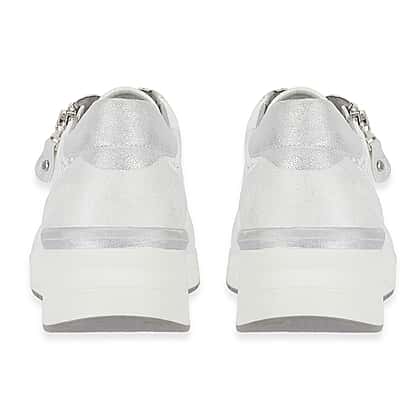 Step out in modern style with the shoreditch womens metallic wedge lace up sneakers with side zip in white. Designed to combine comfort with a subtle lift, these sneakers feature a hidden wedge sole that enhances height while maintaining everyday wearability. The metallic detailing and perforated upper add a contemporary edge, making them easy to pair with jeans, dresses or casual separates. The lace up front ensures a secure fit, while the convenient side zip allows for quick and easy wear. Perfect for daily outings, these sneakers blend fashion and function effortlessly.