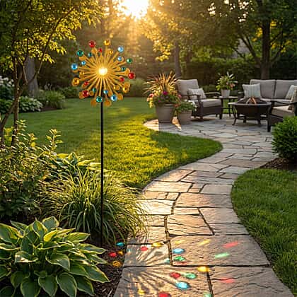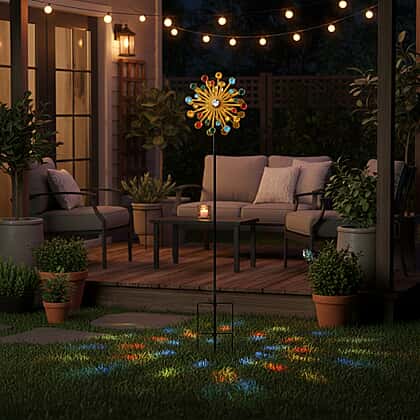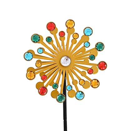 Bring a radiant accent to your outdoor space with this yellow garden showpiece, designed to combine movement, colour and ambient light. The circular form is detailed with evenly spaced elements, each tipped with multi coloured accents that catch light beautifully as the piece rotates with the breeze. Supported by a sturdy stake, it can be placed easily along pathways, lawns or garden borders. The integrated light feature adds a soft glow as evening sets in, extending its appeal beyond daytime use. With its structured design and vibrant detailing, this piece creates a lively and decorative presence in any garden setting.