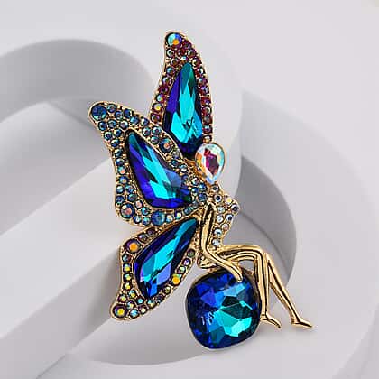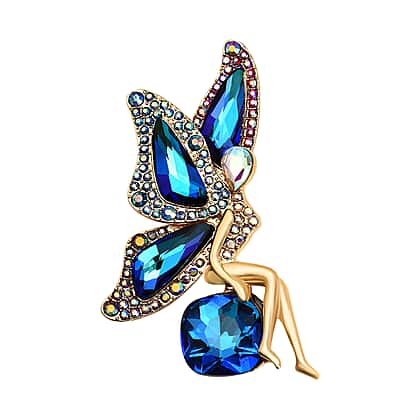 Feel the metamorphosis and transformation that a fairy goes through when you put on this Mercury Mystic Topaz and Simulated Blue Topaz brooch. The fairy has remained a symbol of hope, power, and renewal. This powerful imagery resonates with the wearer who has experienced personal growth, overcoming challenges, and emerging stronger and more beautiful. The pure alloy base looks shiny and regal in a yellow gold tone.
