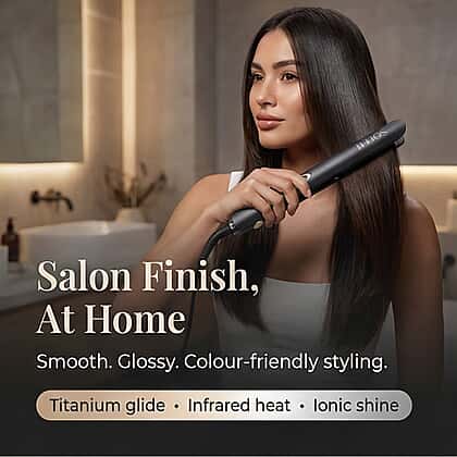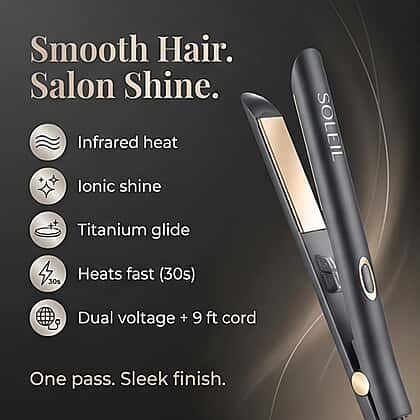 Unlocking the secret to salon-quality results in the comfort of your home. The Soleil Infrared Plus flat iron is your passport to beautifully smooth and healthy locks. Its polished titanium plates glide smoothly without tugging, while deep infrared heat styles from within, protecting the cuticle and preserving your color. Negative ions lock in a mirror-like shine. With rapid MCH heat-up to 450°F in 30 seconds and instant recovery, one pass is all you need. The ionic heat generated by this flat Iron breaks down water molecules into smaller droplets, infusing your hair with moisture. This moisture locks within the hair cuticles, creating a protective shield that reduces chemical and bacterial buildup.