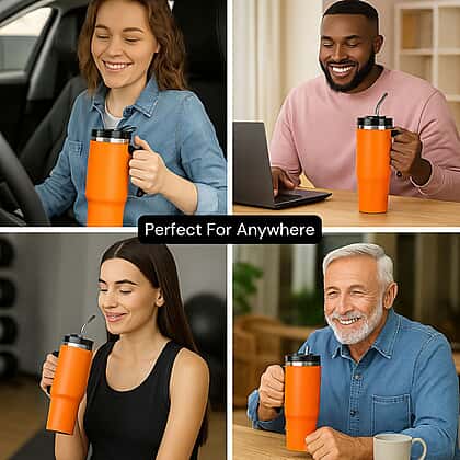 Stainless Steel Tumbler with Straw, Ergonomic Handle & Leak-Proof Lid - Orange - 850ml