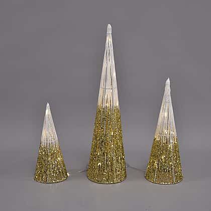 Set of 3 - Metal Wire Cone with Cotton Thread, Glitters and 10/20/30 Warm Micro String Lights - Gold