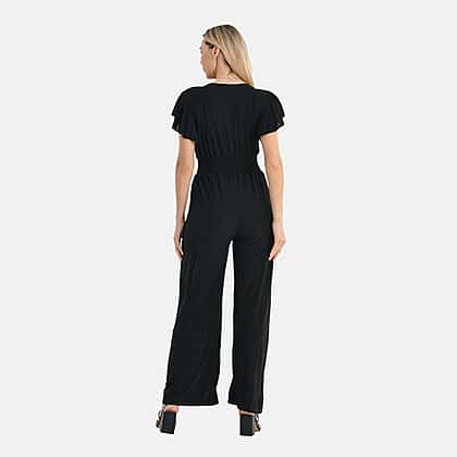 Step into all-day comfort and effortless style with the Tamsy Smocked Waist Stretch Jersey Jumpsuit in timeless black. Crafted from a soft, breathable jersey blend with 3% elastane, it moves with you while holding its shape. The flattering V-neck wrap front and flutter sleeves add feminine charm, while the smocked waist cinches perfectly for a figure-enhancing silhouette. Designed with a pull-on fit, it’s fuss-free and features handy side pockets for everyday ease. The wide-leg trousers balance the proportions beautifully, creating a relaxed yet elegant look. Whether for lounging, brunch, or dinner dates, this jumpsuit promises style without compromising comfort.