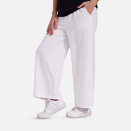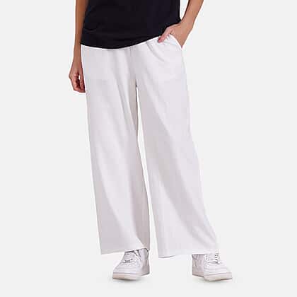 Keep things fresh and simple with these white wide leg lounge trousers by Tamsy. Made from 100% polyester, they provide a soft, relaxed fit that’s ideal for warm days or cosy moments. The elasticated waistband adds ease and flexibility, while the wide-leg shape keeps things light and flattering. With two side pockets to hold the essentials, they combine comfort with clean design. Pair with bold or pastel tops for an easy, polished everyday outfit.