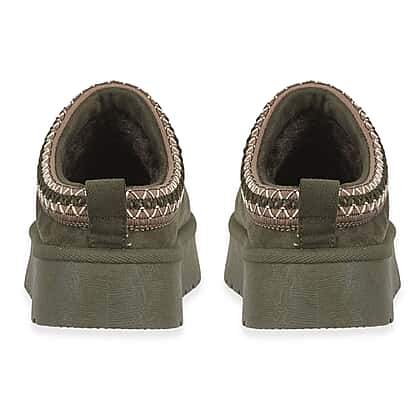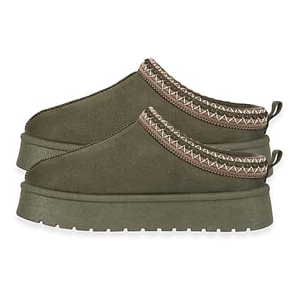 Designed to bring together everyday comfort and modern styling, the Pandora Platform Embroidered Trim Mule Slippers in Olive are a versatile addition to your loungewear collection. The rich olive tone pairs effortlessly with relaxed outfits, while the sturdy platform sole provides subtle lift and steady support. Finished with decorative embroidered trim along the collar, these slip-on mules combine practicality with refined detail. The cushioned interior enhances warmth and softness underfoot, making them ideal for cosy mornings and laid-back evenings at home.