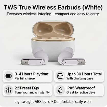 TWS True Wireless Earbuds - 150mAh Charging Case & 3-4 Hour Playtime - White