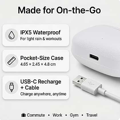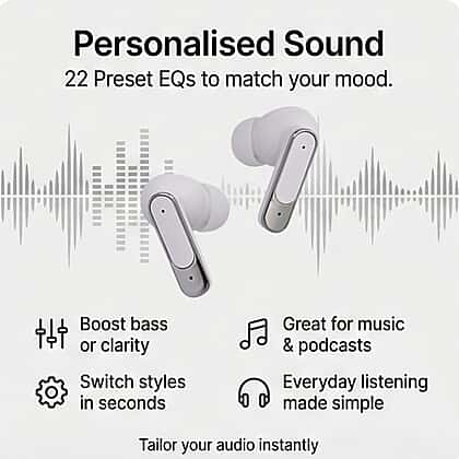 Experience seamless wireless sound with these TWS earbuds, crafted from durable ABS and shaped for all-day comfort. Each bud houses a 28mAh battery, giving you 3–4 hours of playback, while the 150mAh charging case provides up to 30 hours in total. Whether you’re walking, commuting or unwinding at home, the 22 preset EQs let you tailor your audio instantly. The IPX5 waterproof rating adds reassurance during drizzly mornings or workout sessions, and the neat 4.65×2.45×4.8cm case fits effortlessly into pockets or small bags. A dependable, easy-to-use choice for staying connected and entertained on the move.