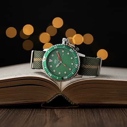 Make a bold sport-led statement with this Majesty quartz PC 32 men’s watch featuring a green hydraulic dial and silver tone case. The textured dial and strong marker layout create a high-visibility display with rugged character. A diver-style bezel with matching green detail adds depth and contrast to the face. Powered by a quartz movement, it delivers consistent daily accuracy. Built with 3 atm water resistance for splash exposure, it suits regular wear. The green nylon strap completes the outdoor-inspired look with flexible, secure comfort.