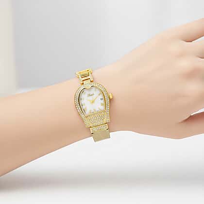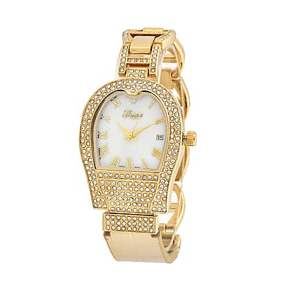 Warm, luxurious tones define this GENOA TIME V2 watch, which features a white mother-of-pearl dial surrounded by sparkling white crystals. The Seiko VJ32 Japan movement with date function ensures precise timekeeping, while IPG plating provides a rich gold finish designed to last. A gold leather strap is paired with a crystal-set alloy section, secured neatly with a stainless-steel buckle for comfortable daily wear. With a steel backing, 3ATM water resistance and a reliable Japan battery, this elegant piece is as practical as it is glamorous. It’s a lovely choice for women who appreciate classic shine with modern detailing.