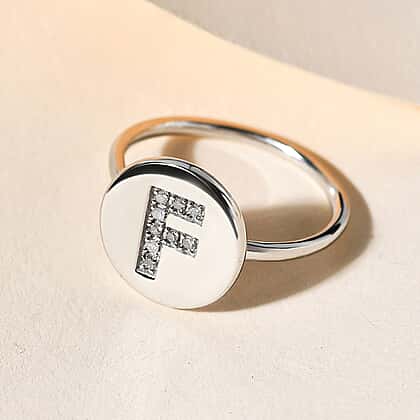 Natural White Diamond Initial-F Ring in Platinum Overlay Sterling Silver.