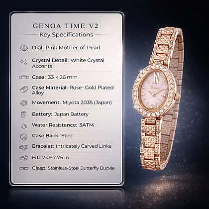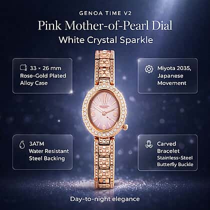 Soft, feminine and effortlessly stylish, this GENOA TIME V2 watch blends a pink mother-of-pearl dial with white crystals for a beautifully polished appearance. The 33×26mm rose-gold plated alloy case pairs perfectly with the intricately carved strap, which is accented with matching crystals and fitted with a stainless-steel butterfly buckle for a secure, comfortable feel. Powered by the reliable Miyota 2035 Japan movement and a Japan battery, it delivers accurate timekeeping you can trust. With its steel backing, 3ATM water resistance and 7.0–7.75 inch wearable fit, it’s an elegant addition to both daytime and evening outfits.