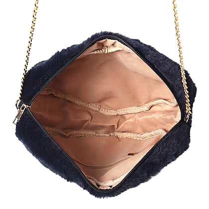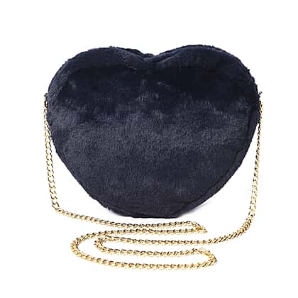 Navy Faux Fur Heart-Shaped Crossbody Bag with Chain Shoulder Strap in Gold Tone