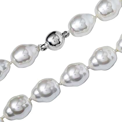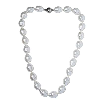 Drape yourself in the luminous elegance of our white shell pearl necklace, a treasure crafted with baroque pearls for an exquisite touch of luxury. Each pearl is intricately strung on durable thread, culminating in a 20-inch cascade of iridescence. The magnetic clasp, made of rhodium overlay on sterling silver, ensures secure fastening, and keeps the necklace in place.