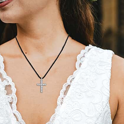 9K White Gold Diamond Cross Pendant on Adjustable Black Cord Necklace 16 Inch