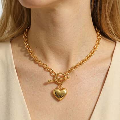 This T-bar gold chain necklace is designed for both women who love to accessorise their looks. The necklace crafted in yellow gold features a heart charm and is locked with a T-bar clasp that lends it a bold look. The oval belcher chain accents the look of the necklace. 16-Inch length lends a choker effect that is perfect for day-dressing and evening wear.