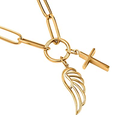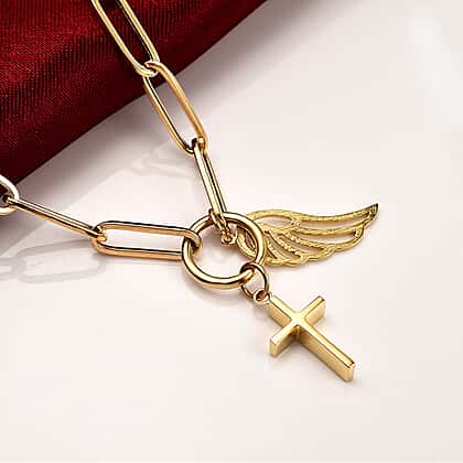 - The necklace features a cross and a single angle wing
