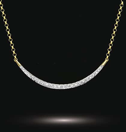 This exquisite necklace features an exquisite crescent-shaped bar design crafted from premium quality metal and adorned with gleaming diamonds. The unique crescent bar design gives this necklace a contemporary and sophisticated look, making it an ideal choice for anyone looking for a truly one-of-a-kind piece of jewellery. The necklace is adjustable, allowing you to wear it at different lengths, making it versatile and easy to pair with any outfit. The diamonds are hand-selected and expertly set, adding an extra touch of luxury and elegance to this piece. It is a perfect way to add a touch of sophistication and personality to your everyday look, and it is a great gift for someone special