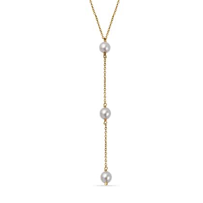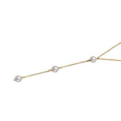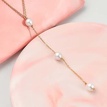 The timeless elegance of a pearl necklace gets a playful twist in this 9K Yellow Gold Drop Pearl Necklace. Designed in the Lariat style, it features a row of three pearls held within the delicate chain. The Size 17-18 necklace looks lovely with low necklines and is the perfect accessory to add a romantic touch to your flowy dresses.