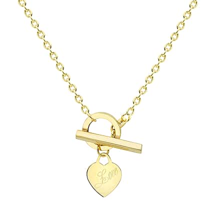 9K Yellow Gold 'Love' Heart Tag Trace Chain T Bar Necklace 18 Inch