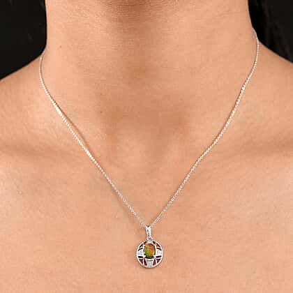 AA Ammolite & White Zircon Pendant with Chain (Size 20) in Rhodium Overlay Sterling Silver 1.49 Ct.