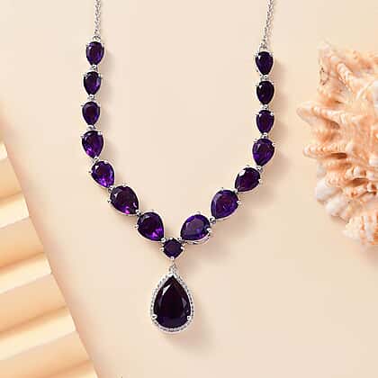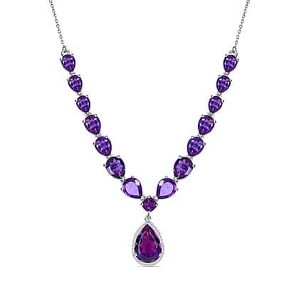 Designed to captivate, this African amethyst and white zircon drop necklace is a breathtaking display of elegance and refinement. Featuring a stunning arrangement of rich purple African amethysts, the design cascades gracefully, leading to a pear-shaped centre stone framed by shimmering white zircons for added brilliance. Crafted in rhodium-plated sterling silver, the necklace offers a hypoallergenic, tarnish-resistant finish, ensuring long-lasting beauty. The delicate yet secure lobster clasp provides a comfortable fit, making this piece perfect for glamorous evenings, weddings, or formal occasions. A true statement of luxury, this necklace exudes timeless sophistication and is destined to be treasured forever.