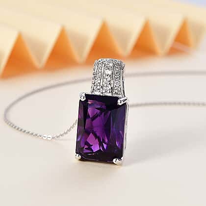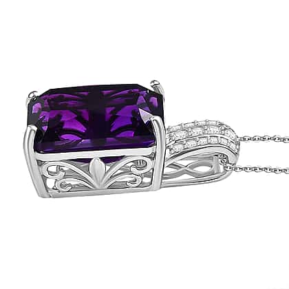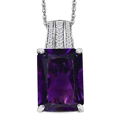 AAA African Amethyst & White Zircon Pendant with Chain (Size - 20) in Rhodium Overlay Sterling Silver 15.45 Ct.