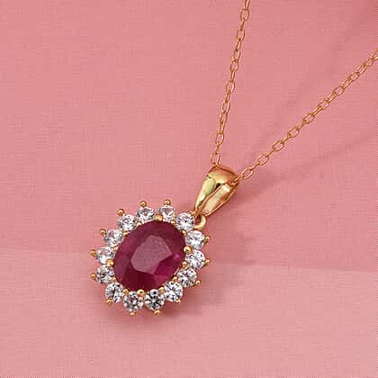 AAA African Ruby, White Zircon Sunburst Halo Pendant with Chain (Size 20) in Yellow Gold Plated Sterling Silver 2.69 Ct.
