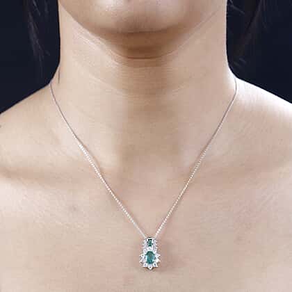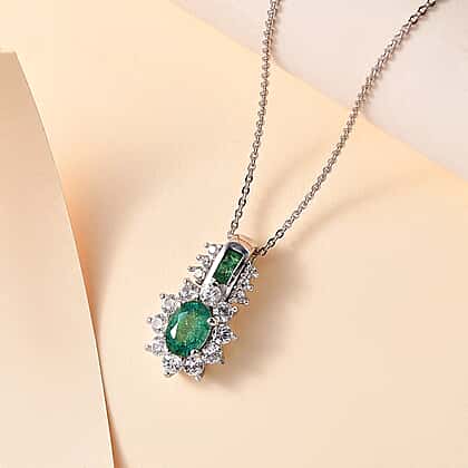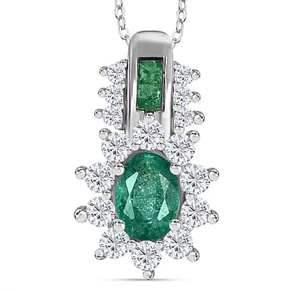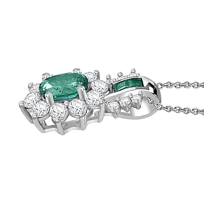 AAA Zambian Emerald and White Zircon Pendant with Chain (Size - 20) in Rhodium Overlay Sterling Silver 1.61 Ct.