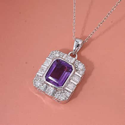 African Amethyst & White Zircon Pendant with Chain (Size 20) in Rhodium Overlay Sterling Silver 3.32 Ct.