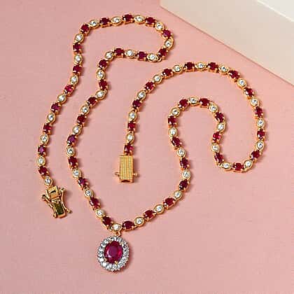 Get an enchanting look with this Cabo Delgado ruby and zircon necklace. The exquisite design of this ruby and zircon necklace provides a lovely hue to every attire you wish to carry. The pendant pronged with prominent oval cut ruby is haloed by the shimmering zircon, dropping from the fantastic chain. The necklace chain is crafted with a bezel setting of zircon pieces along with the tiny pronged ruby creating a magical and unique neck ornament for you to adorn. The vintage craft of this necklace is made with solid sterling silver with a yellow tone.