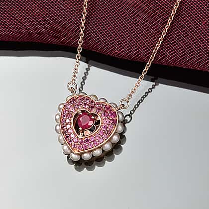 Celebrate love with this striking heart shaped ring, featuring african ruby at the heart of the necklace that captures attention. Mainstone surrounded by a halo of rhodolite garnets, the piece exudes enduring allure and charm. The white pearl encircles the design, enhancing the beauty of centrestones. Expertly made from 925 sterling silver with 18K vermeil yellow gold plating for ensuring shine and lustrous finish. Lightweight and hypoallergenic, this necklace is safe and comfortable for sensitive skin. Perfect piece for special evenings, gifting, anniversaries, and personal styling to draw attention. Celebrate your love with this stunning necklace as a token of love and commitment.