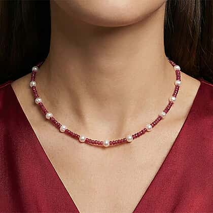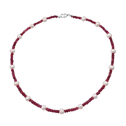 African Ruby & Water Pearl Necklace (Size - 18) in Rhodium OverlaySterling Silver 90.000 Ct.