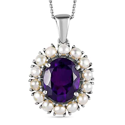 2 Piece Set - African Amethyst, Fresh Water Pearl Chain (Size - 20 ) and Solitaire Pendant in Platinum Overlay Sterling Silver