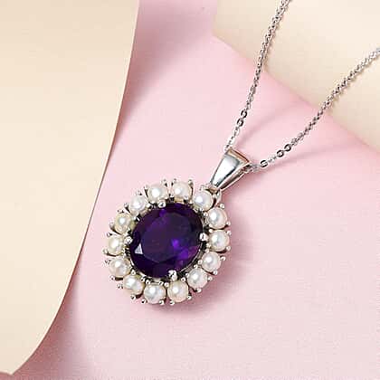 Amethyst and Fresh Water Pearl Pendant with Chain (Size - 20) in Platinum Overlay Sterling Silver 6.55 Ct