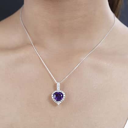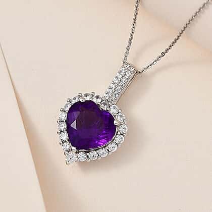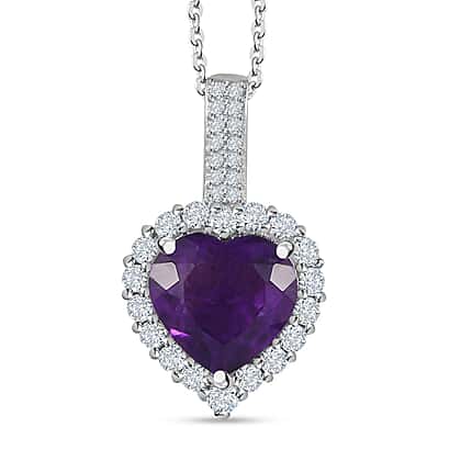 Enhance your style with this exquisite African amethyst heart pendant, designed to capture the attention. Laced with a halo of dazzling white zircon rounds, this pendant features heart-shaped amethyst at its center with intense violet hues. The bail, adorned with additional zircon rounds, enhances the pendant's brilliance, making it a true statement piece. Crafted in platinum overlay sterling silver, this pendant exudes sophistication and elegance. Paired with a 20-inch chain, it adds a touch of luxury to any ensemble, making it perfect for both everyday wear and special occasions.