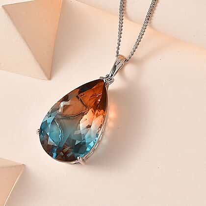 Suspended in elegance, the Aqua Terra Costa quartz pendant is a captivating addition to any jewellery collection. Its enchanting teardrop shape, showcasing a kaleidoscope of oceanic blues and earthy tones, reflects the beauty of natural landscapes. The pendant is gracefully complemented by a platinum overlay sterling silver chain, making it a versatile piece for day and night wear.