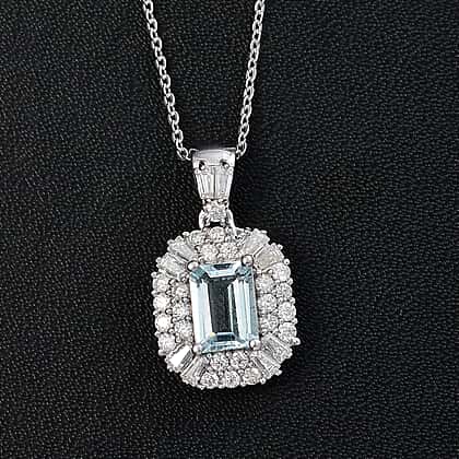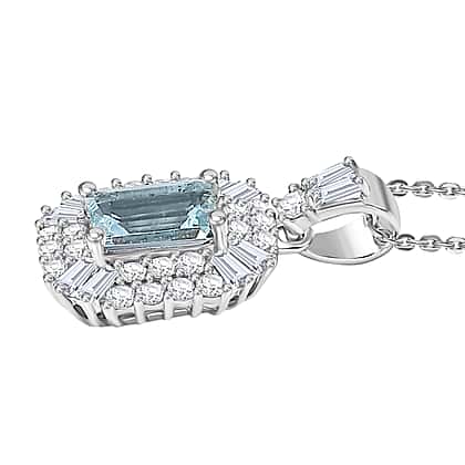 Aquamarine & Moissanite Pendant with Chain (Size 20) in Rhodium Overlay Sterling Silver 1.58 Ct, Silver Wt. 7.11