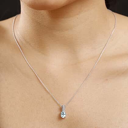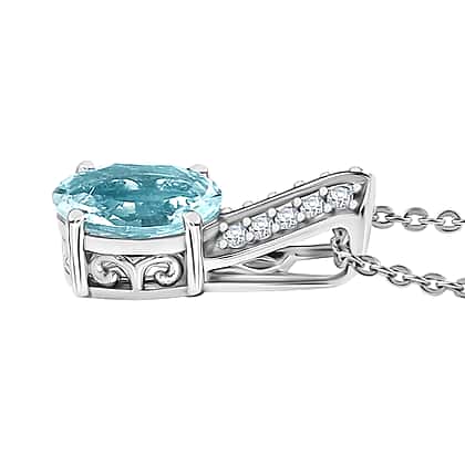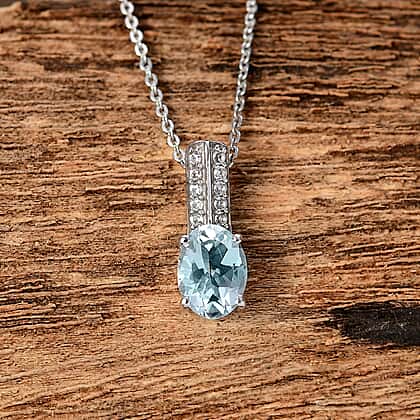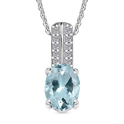 Aquamarine & White Zircon Pendant with Chain (Size 20) in Rhodium Overlay Sterling Silver 1.70 Ct.
