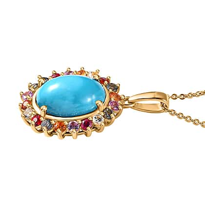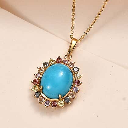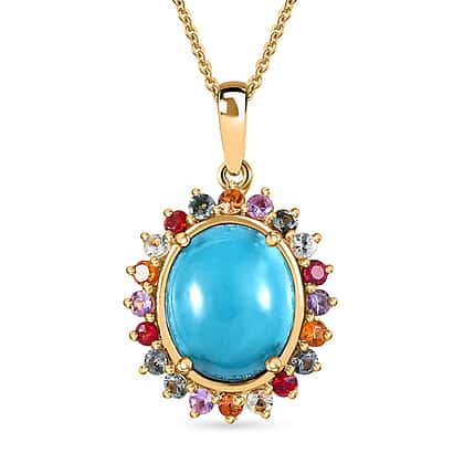Arizona Sleeping Beauty Turquoise & Multi Sapphire Pendant with Chain (Size 20) in 18K Vermeil Yellow Gold Plated Sterling Silver 4.74 Ct, Silver Wt. 5.17 Gms