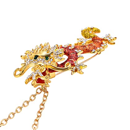 The majestic Chinese dragon brooch cum pendant embodies strength and fierceness. Traditionally, they are believed to bring good luck and fortune into the wearer's life. This accessory features an intricately embellished dragon motif with its curving, sinuous body. It features splashes of red, orange, and yellow hues along with a flickering tongue that lends it a fiery look. It also entails details like the delicate wings and sharp claws of the dragon that help to add to the ferocity of the design. This accessory is adorned with tiny green Austrian crystals forming the eyes and is also decked with white Austrian crystals on the tails and wings of the dragon.