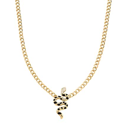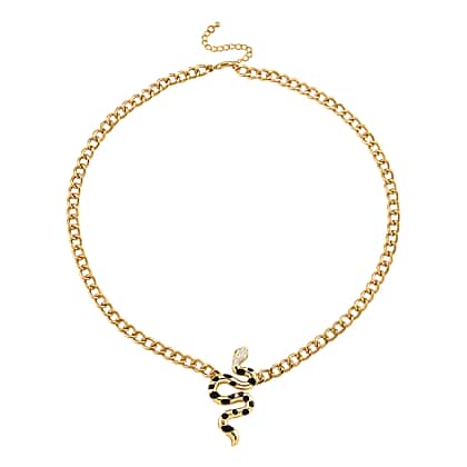 Refresh your jewellery collection this season by adding this daring, serpent-inspired Austrian white and green crystal necklace. Crafted in yellow plated gold, set in pure brass this necklace features a chunky chain attached to a sculpted snake. It features the sinuous body of the snake adorned with black scales and head covered with sparkling white crystals. The two green crystals form the eyes of the snake and lend it an intense look. This necklace can symbolise transformation and wisdom and is perfect to add a bit of fierceness to your look.