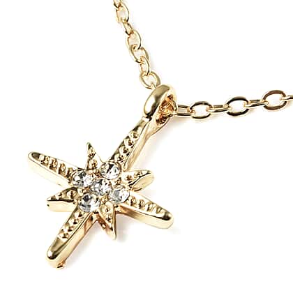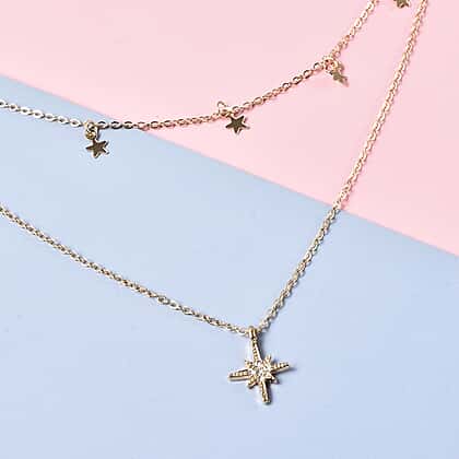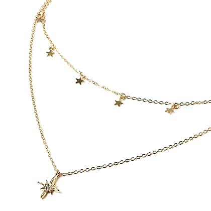 Austrian White Crystal Double Layer Star and Starburst Necklace (Size 16 with 4 inch Extender) in Gold Tone