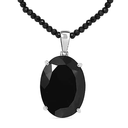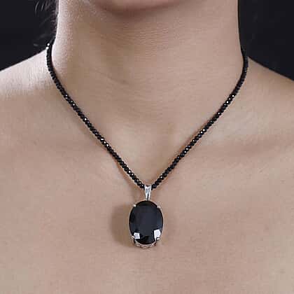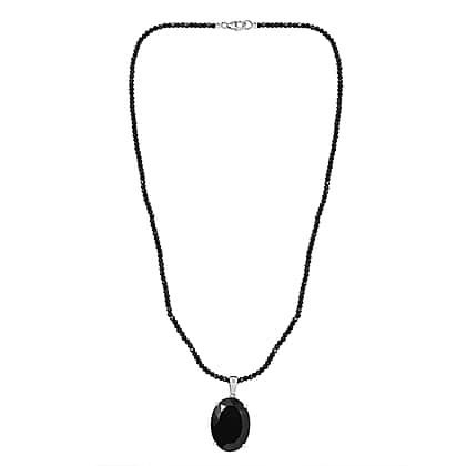 Black Spinel Pendant with Beads Chain (Size 20) in Rhodium Overlay Sterling Silver 50.00 ct.