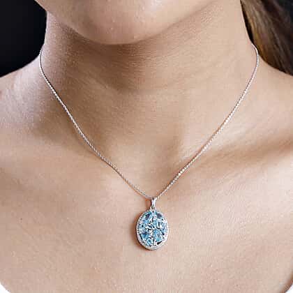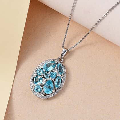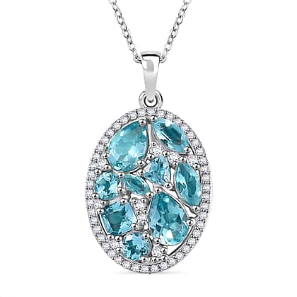 Lagoon Apatite, White Zircon Cluster Pendant with Chain (Size 20) in Rhodium Overlay Sterling Silver 3.62 Ct