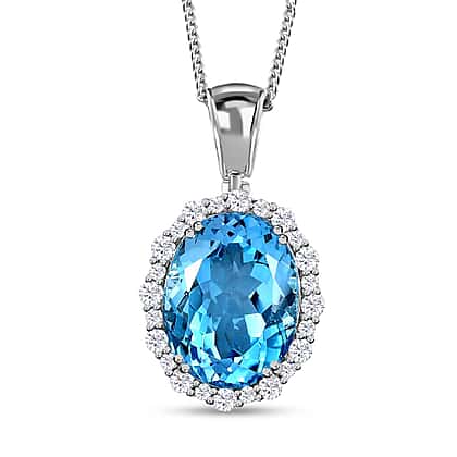 Blue Topaz & Natural Zircon Halo Pendant with Chain (Size 20) in Platinum Overlay Sterling Silver 22.83 Ct, Silver Wt. 9.00 Gms