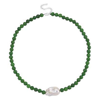BRAND NEW - Green Jade & White Baroque Pearl Necklace (Size 20 - 2 Ext) in Rhodium Overlay Sterling Silver 290.00 Ct.